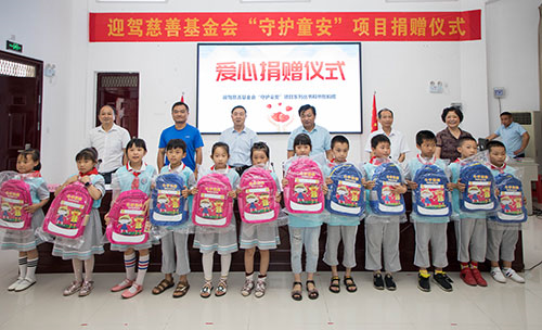 儀式上,迎駕慈善基金會(huì)向東西溪、大化坪、上土市等10所學(xué)校的師生代表捐贈(zèng)了“素質(zhì)教育——守護(hù)童安”系列圖書和學(xué)生安全書包。