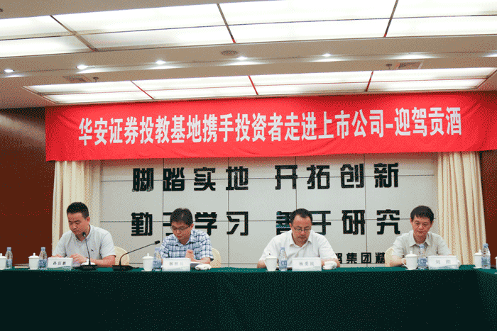 6月25日,由迎駕貢酒聯(lián)合華安證券舉辦的“理性投資 從我做起·走進(jìn)上市公司”活動(dòng)在迎駕成功舉辦。華安證券總經(jīng)理?xiàng)類?ài)民、安徽證監(jiān)局投保處副處長(zhǎng)劉剛及投資者一行40余人走進(jìn)迎駕貢酒參觀交流,迎駕貢酒股份有限公司總經(jīng)理?xiàng)钫毡?/span>接待了來(lái)訪投資者。