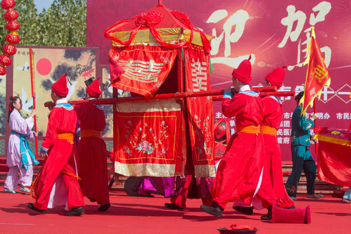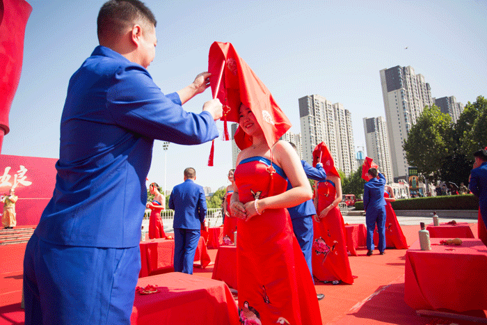 在傳統(tǒng)婚俗表演結(jié)束后,集體婚禮正式拉開帷幕?;顒蝇F(xiàn)場,20對新人身著禮服,莊重地進入典禮現(xiàn)場。在婚禮執(zhí)事的指引下,新人們依次進行邁火盆、三拜、掀蓋頭、行結(jié)發(fā)禮、飲合巹酒等環(huán)節(jié),盡顯傳統(tǒng)婚禮儀式的莊重典雅。