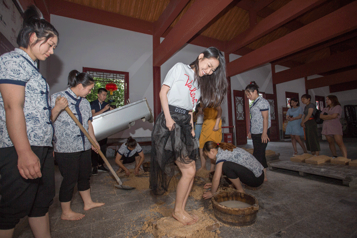 大家還一起欣賞了古法女工踩曲,女工腳法細(xì)膩、用力均勻,踩制的曲塊緊疏適宜,連嘉賓們也忍不住上前一試。