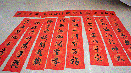 活動現(xiàn)場氣氛熱烈、翰墨飄香、人頭攢動,來自縣書法家協(xié)會的五名書法家現(xiàn)場潑墨揮毫,將一副副承載著新春祝福和對幸福生活美好愿景的春聯(lián)、一個個喜氣四溢的福字送到員工手中,溫暖了每一顆心靈。不一會功夫,現(xiàn)場就擺滿了各式各樣的對聯(lián)和福字,紅彤彤的一片顯得格外喜慶,年味十足。